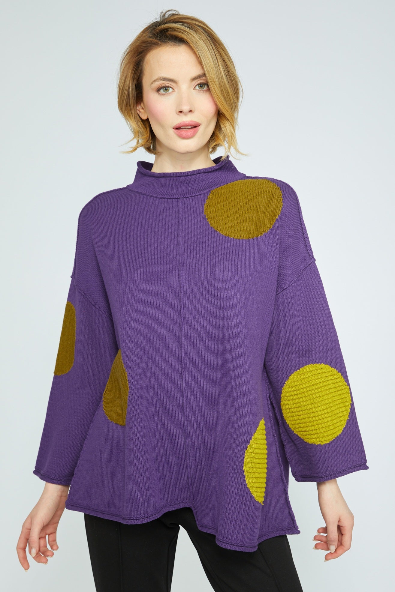 Color, texture and pattern play together in our 100% cotton statement sweater. Light in weight, heavy in style. Textured knit circles are tossed in all the right places.