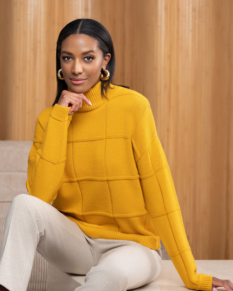 Wrap yourself in cozy comfort with the Alison Sheri Sweater in Amber Yellow. Made from a soft blend of 60% cotton and 40% acrylic, this long-sleeve turtleneck offers warmth without the itch. Its sunny hue and snug fit make it the perfect playful pick for chilly days, adding a cheerful pop of color to any outfit. Stay stylishly snug all season long!