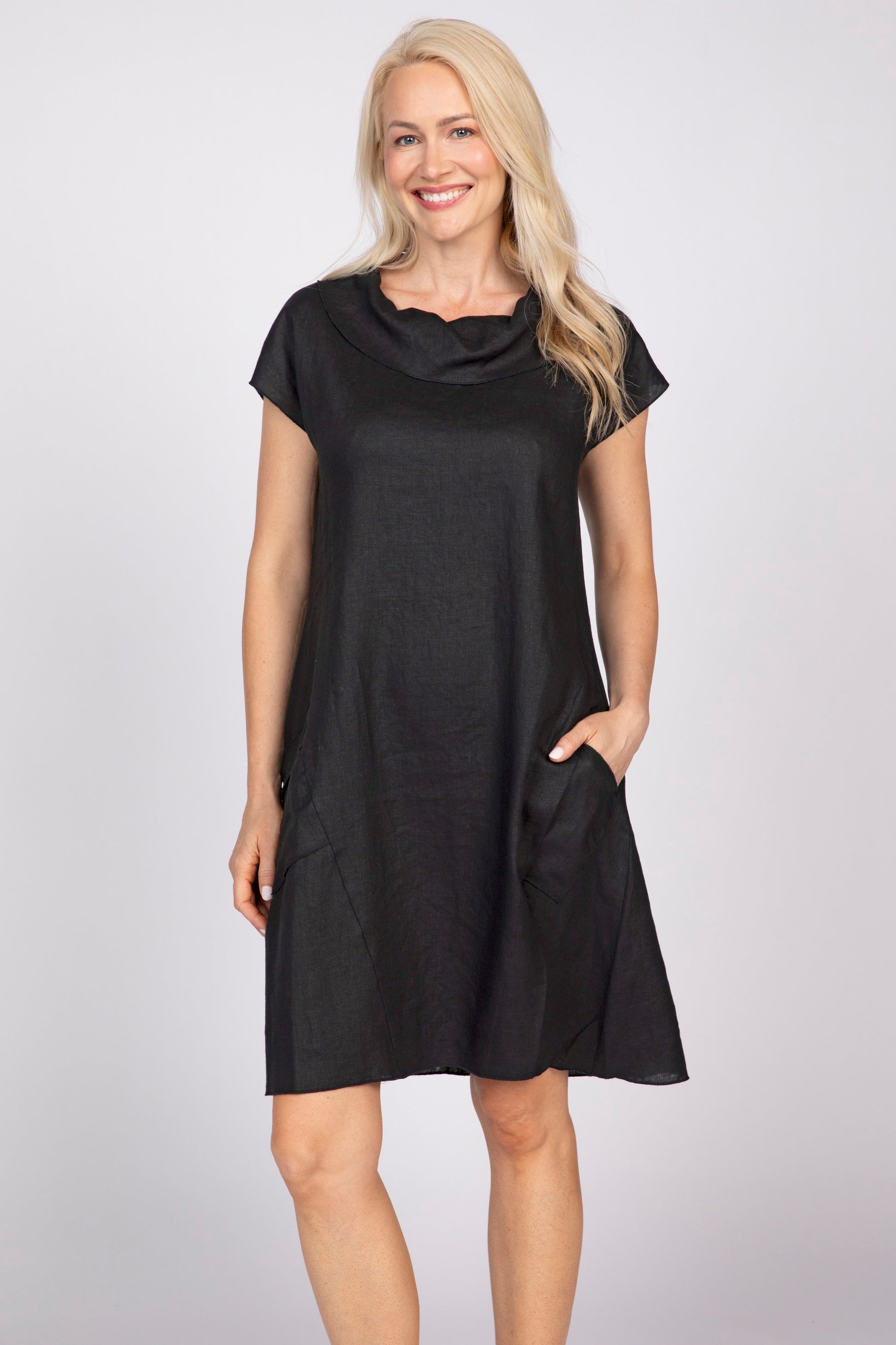 The Olivia by Habitat Impress Dress in black combines effortless elegance with everyday practicality. Crafted from breathable linen, this versatile piece features a graceful cowl neckline and comfortable short sleeves. Functional pockets add convenience to the flattering silhouette, making it perfect for warm-weather styling—from casual outings to relaxed gatherings. A timeless wardrobe essential that transitions seamlessly from day to night.