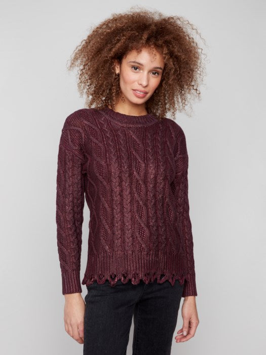 CHARLIE B METALLIC CABLE KNIT SWEATER - WINE