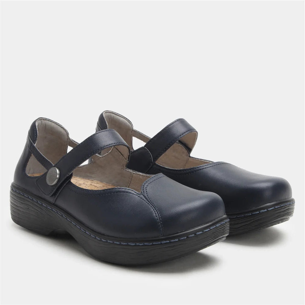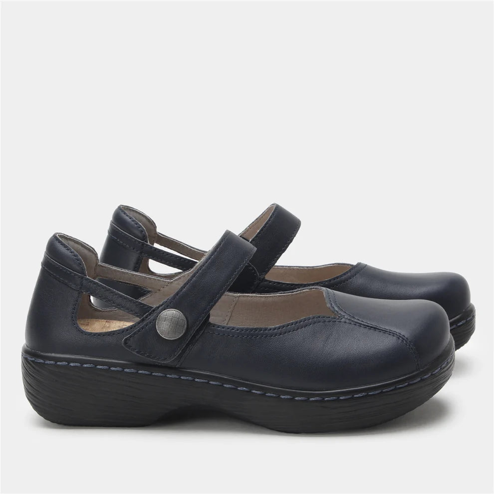 Polished, professional, and built for comfort—the Alegria Onika in Official is your go-to Mary Jane for office wear and beyond. This version features a smooth, dark navy leather upper with subtle sheen, perfectly suited for uniforms, dress codes, or refined everyday style. The adjustable hook-and-loop strap with a decorative button offers a secure fit, while the softly padded collar and patented Alegria footbed keep your feet supported all day. The wood-look rocker outsole adds a natural touch to this otherwise sleek design. Whether at work or on the move, the Onika in Official keeps comfort and style in sync.