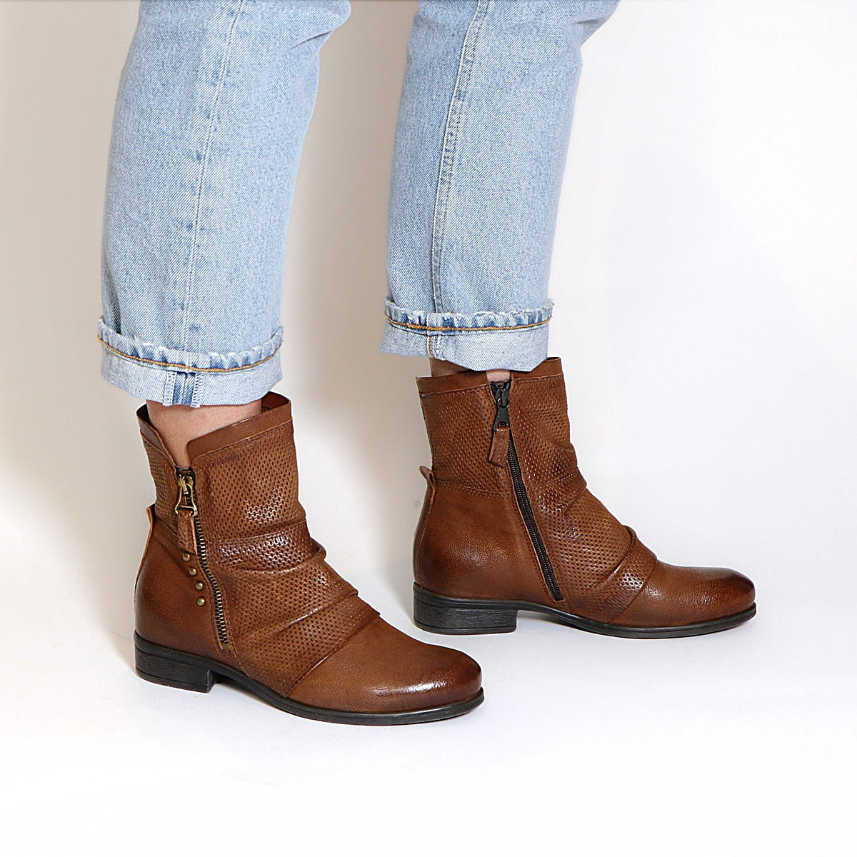 Adventure awaits you in the Miz Mooz Sandi. A stylish bootie featuring perforated leather, zipper detailing, and soft microstud embellishments, the Sandi hints at edge while remaining practical and feminine. Perfect to throw on with jeans or as a contrasting statement to a dress and tights, this boot will keep you ahead of the trends this season.Â
