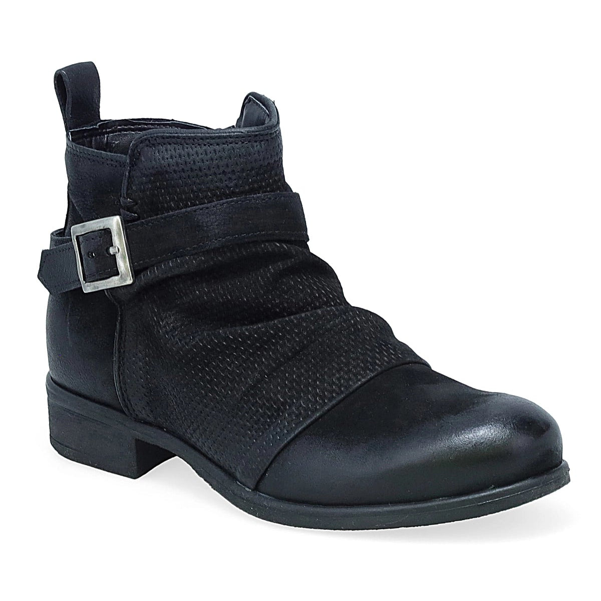 Enjoy the sophisticated, rock & roll vibes of the Miz Mooz Suzy, your new favorite bootie! Leather ankle straps and metal hardware keep things fun and a little edgy. The soft, perforated leather upper, slightly lifted heel, and perfectly rounded toe make for a versatile wear-all-day pair!