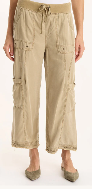 A stretchy, thick knit drawstring waistband ensures extra comfort on this wide-leg Soft Twill cargo style. Plentiful pocket, an added central pleat at the leg for added soft volume, and raw-edge hem round out the utility-inspired style.
