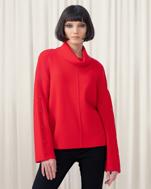 Cozy up in the Elena Wang Sweater, featuring a playful cowl-neck collar and charming button details on the long sleeves. Crafted from a soft blend of viscose, polyester, and nylon, this vibrant red sweater delivers comfort and style with every wear. Perfect for adding a pop of color and personality to your look!
