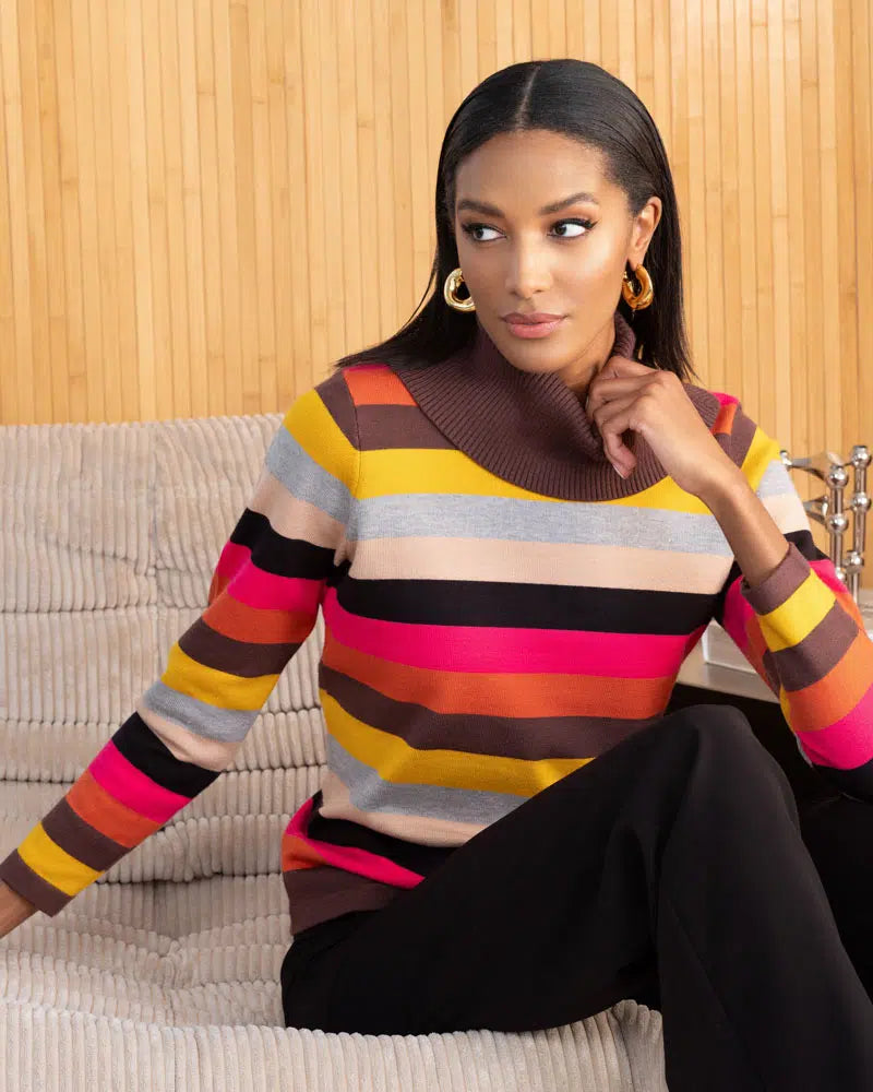 Wrap yourself in cozy charm with the Alison Sheri striped sweater. This long-sleeve, turtleneck piece blends soft viscose and poly for a comfy, breathable feel. Its vibrant multi-color stripes add a playful pop to your fall wardrobe, perfect for layering on crisp days. Stay warm and stylish without losing a touch of fun!