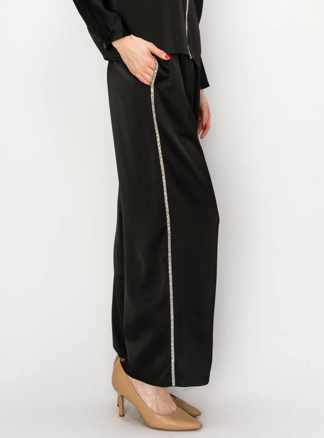Elegant and classy. The Wynne pant. Made beautifully with smooth satin fabric. Stunning diamonds going down the sides. Elastic waist for the perfect fit. Side pockets. Easy relax fit. Day wear and transition to night. Stylish and sophisticated.